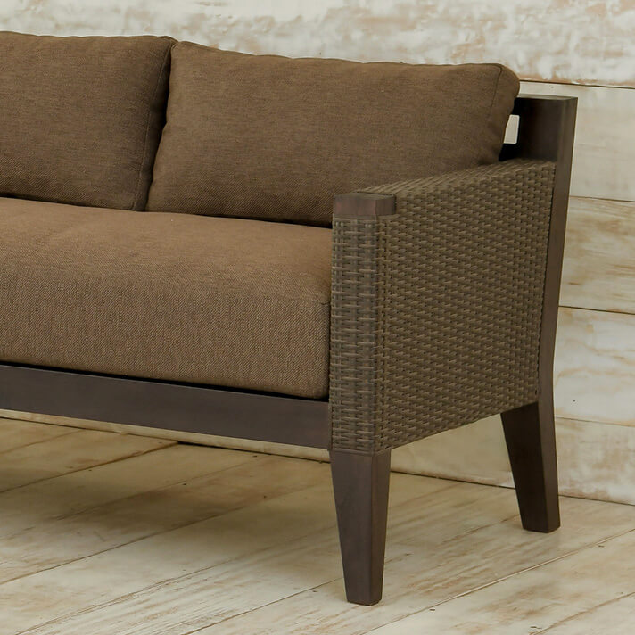 フレームにはチーク無垢材と上質なシンセティックラタン、背もたれと座面のクッションには高級ファブリックメーカーの生地を使用し、