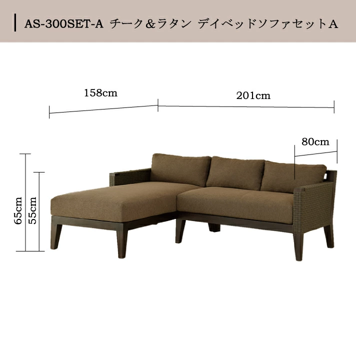 ゆったりくつろげるチークとラタンのソファ 【受注生産品】 チーク&ラタン デイベッドソファセットA (左L字) [Alam Sari アラムサリ] 【AS-300SET-A】 セミオーダー対応