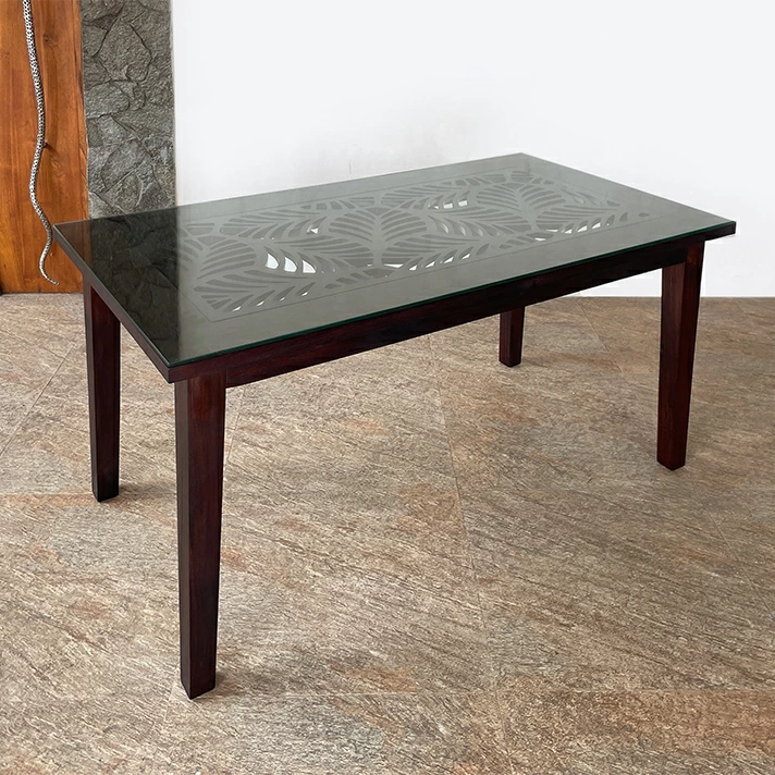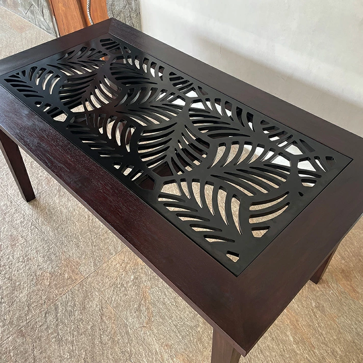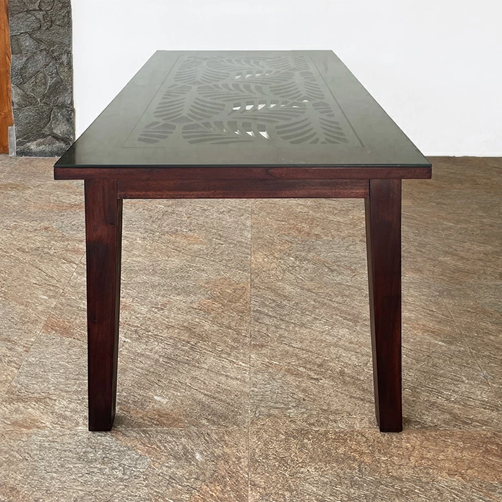 天板に施されたMDF素材の美しいカービングモチーフが、チーク無垢材の美しさを一層引き立てます。