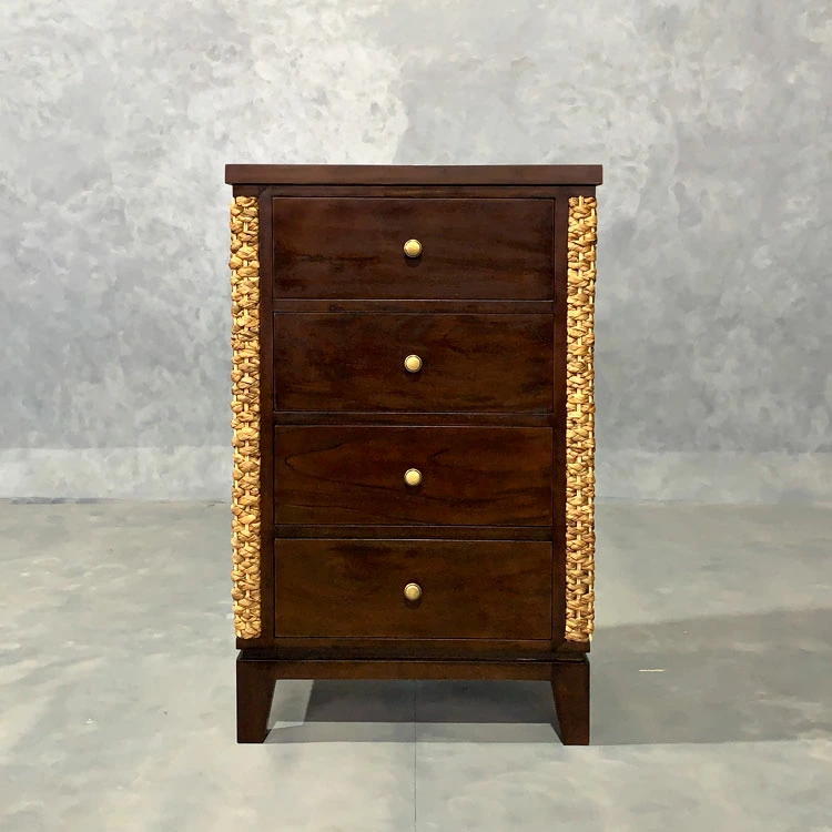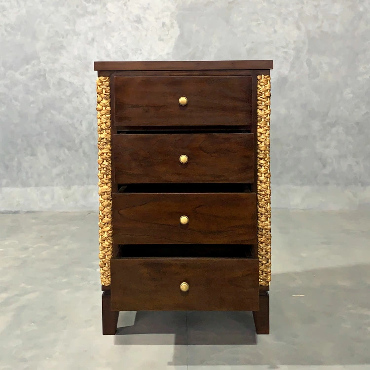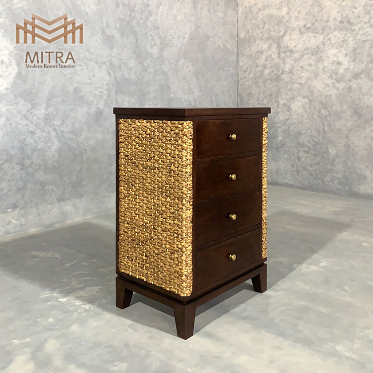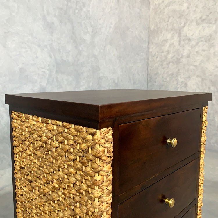 熟練した職人が一つ一つ丁寧に編み込んだウォーターヒヤシンスと高級木材のマホガニーを組み合わせた「MITRA」のキャビネット。